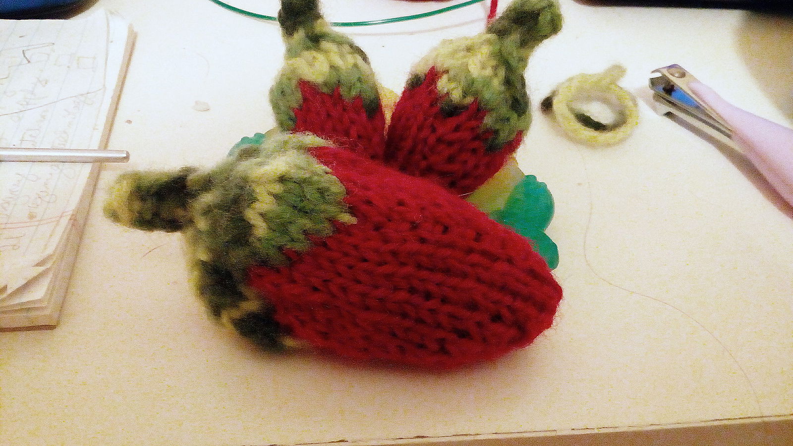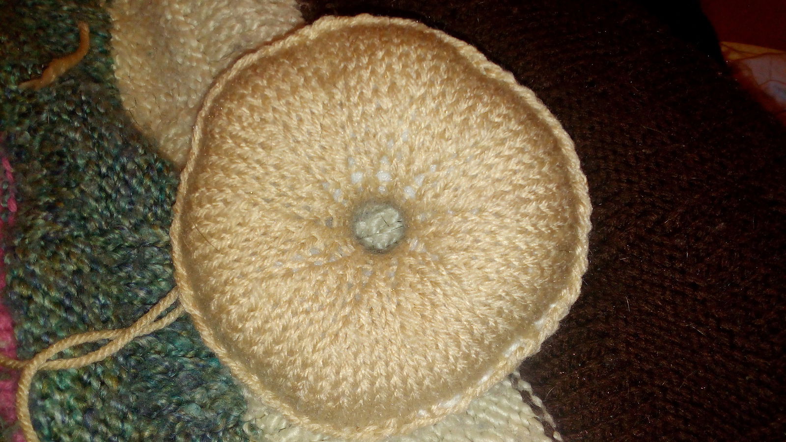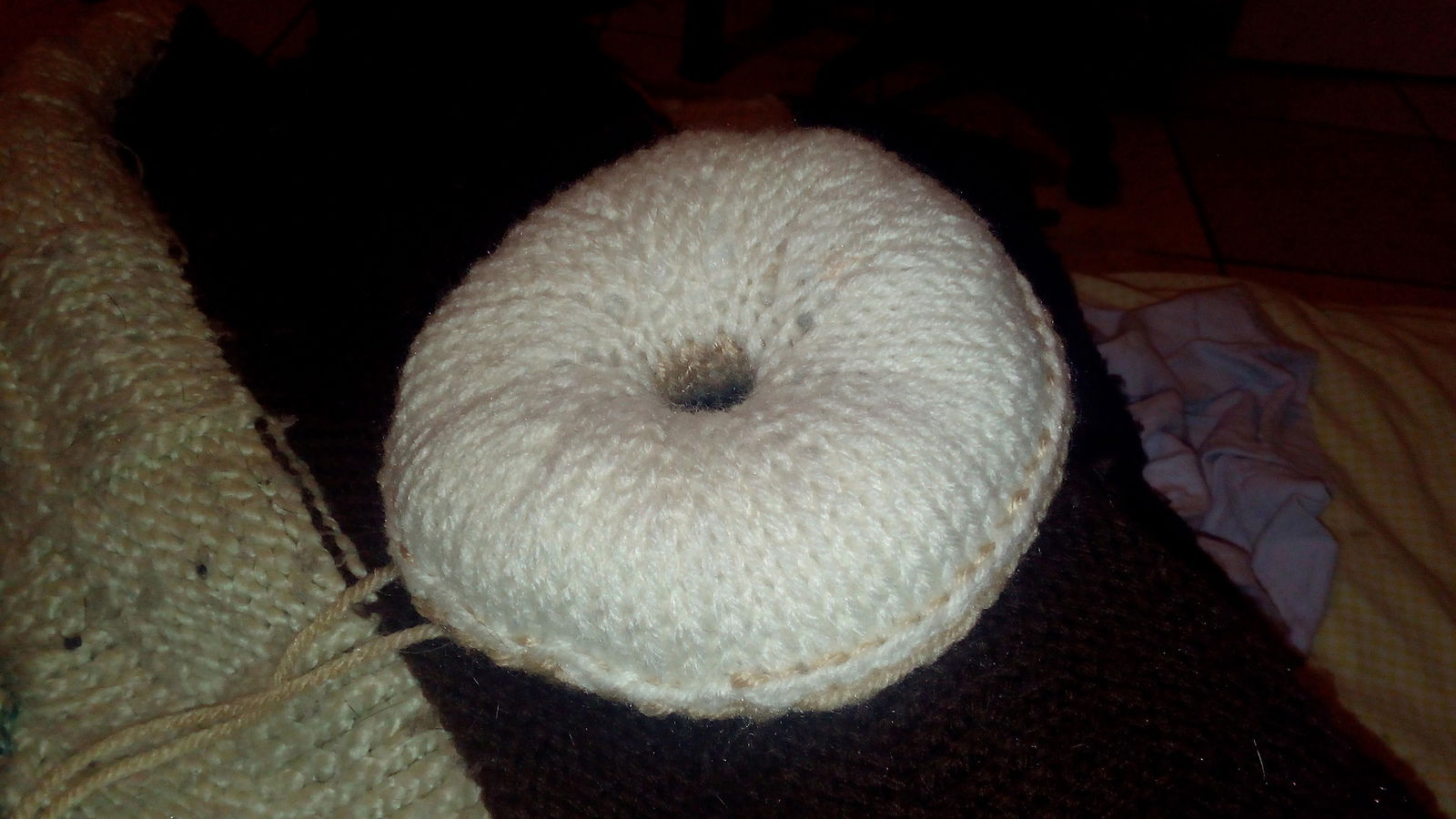 I wanted to make another in just the tan so that she could have a bagel, too, but I didn't want to confuse her, so I'll save that for another day. I made this one myself after looking at a couple different in-progress pics of donut patterns and thinking "oh, I know how to do that, actually. It's pretty ingenuous, You start at the middle (which you can probably see from the seam there) work all one color, decrease down to the center, then increase back out in your next color for the top, turn it inside out, and seam it. I fiddled a bit with the center size, trying to see which I liked best, but I do love a fluffy donut in real life, so I decided to go with the smaller center. I'm thinking of writing this up as a pattern too, but there are already do many out there, I'm not sure it's worth it. We'll see, I guess.