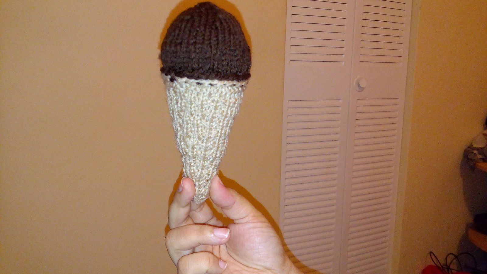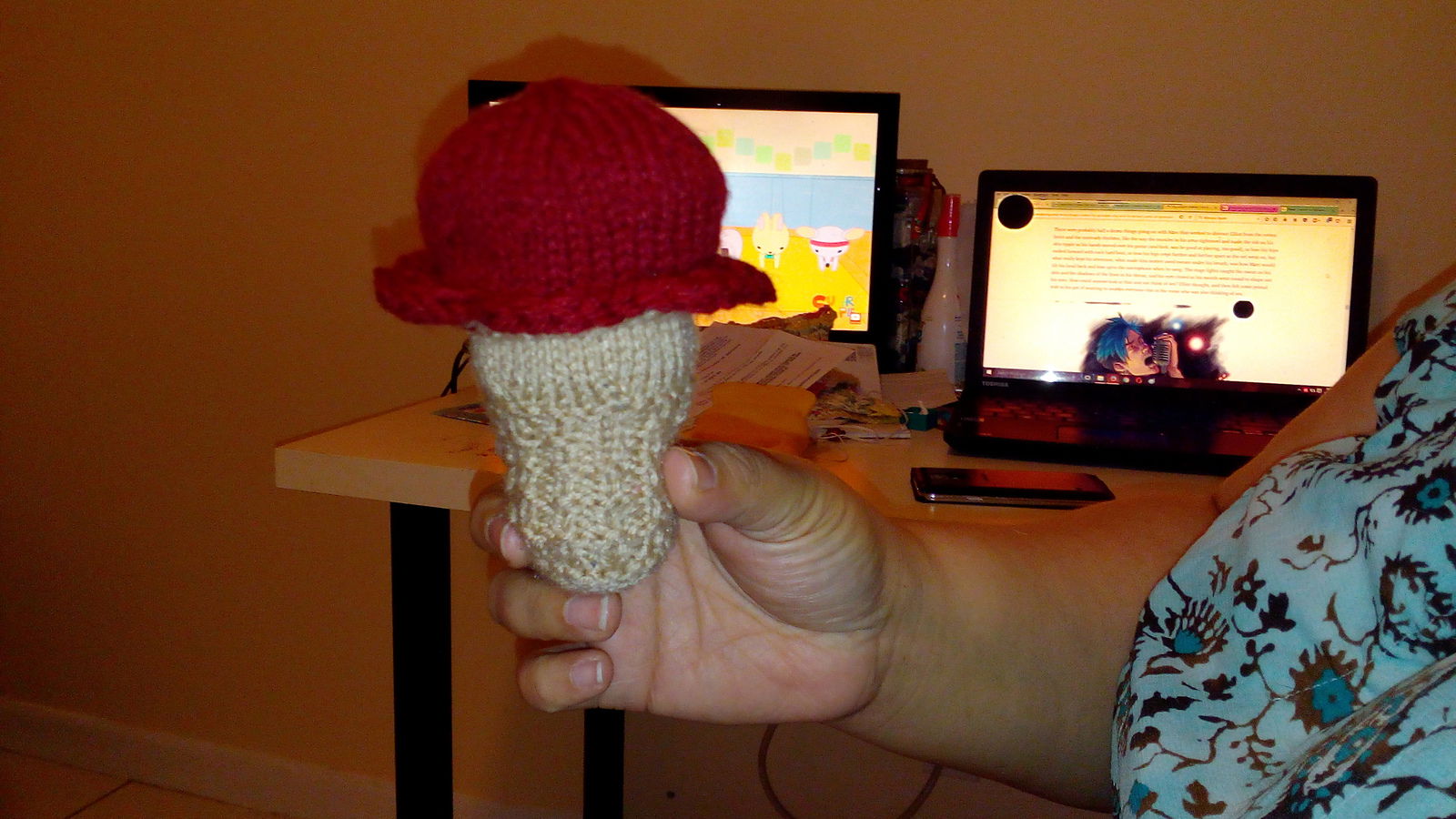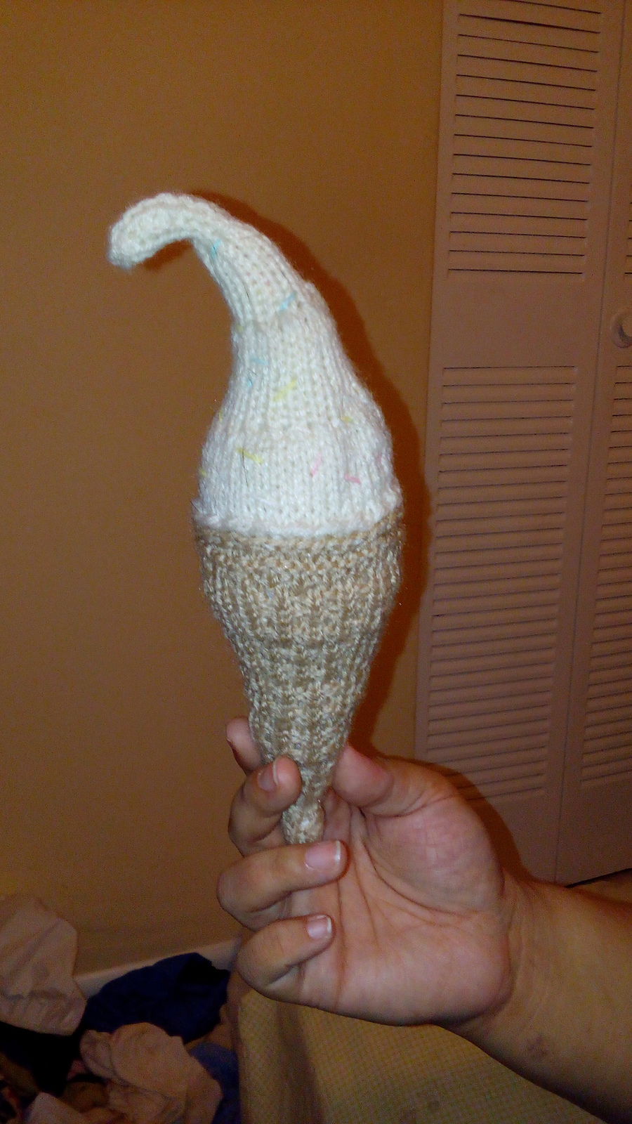 I did modify the pattern a little bit; the sherbet scoop wasn't really turning out right when I did it as written, so I just ignored that part and worked it like a dip cone, then went back and did *sc, skip 2, 5 DC shell, skip 2* in the cast on to make the frilly bit. I liked how it turned out at least, and Monster Baby was saying "ice cream! ice cream!" while I was seaming up, so it seems legit. The pattern was